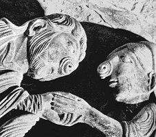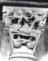 An example of a historiated capital, this depicts the parable of the Rich Man and Lazarus told in Luke 16:19-31. Hellish demons, common in Romanesque art, take the soul of the rich man while snakes devour his riches under the bed; on the other side of the capital the soul of the poor man (souls in medieval art are always depicted as babies) is taken to heaven. A word to the wise should be sufficient! | ||