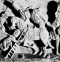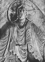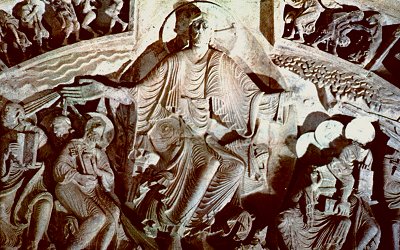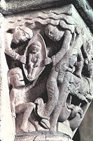 On the lintel and above in the archvolts the artist has depicted exotic and strange peoples to be converted--pygmies and snout-nosed figures. Hunchbacks, the lame, and the blind are represented as well, all indicating the variety of defects humans are prey to and their need for salvation to come. | ![]() |