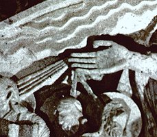 In the commissioning of the apostles (above), Christ's hands have rays or blood extending from them (rays would signify the commissioning or blood would signify redemption). |