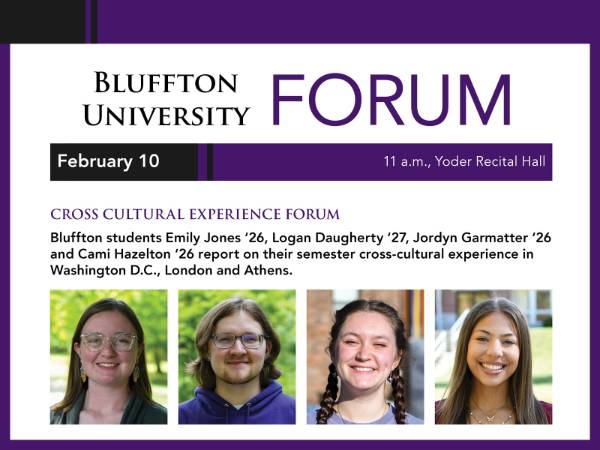 Bluffton University students Emily Jones '26, Logan Daughtery '27, Jordan Garmatter '26 and Cami Hazelton '26 will present a Cross-Cultural Experience Forum.